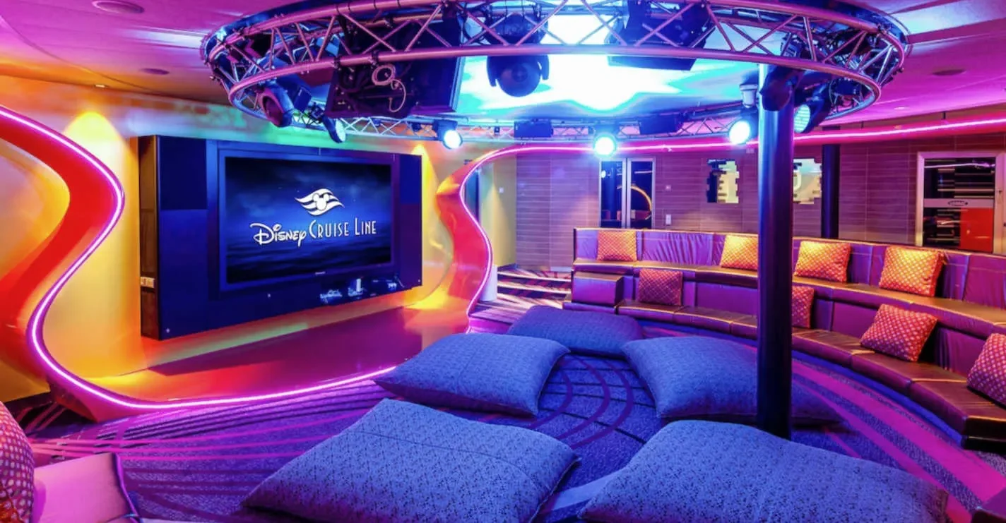 Vibe is Disney Cruise Line’s teen club just for ages 14–18, and it is such a fun and safe place to hang out. It’s designed just for teens, so it doesn’t feel little-kid-ish at all. There are comfy couches, cool lighting, music playing, and spaces to either relax or jump into activities. You can chill in a quieter area and talk with new friends, or join a game and be right in the middle of the action.